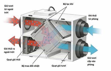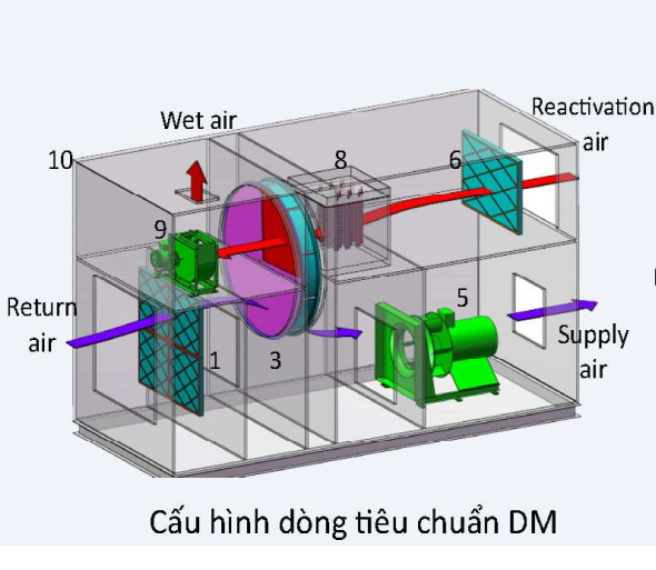 Đặc điểm: Sử dụng một bánh xe quay chứa vật liệu hút ẩm (như silica gel). Không khí ẩm đi qua bánh xe, hơi nước bị giữ lại. Một luồng khí nóng khác sẽ đi qua phần bánh xe đã "bão hòa" để "sấy" khô vật liệu hút ẩm, thải hơi nước ra ngoài.